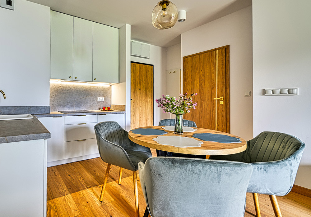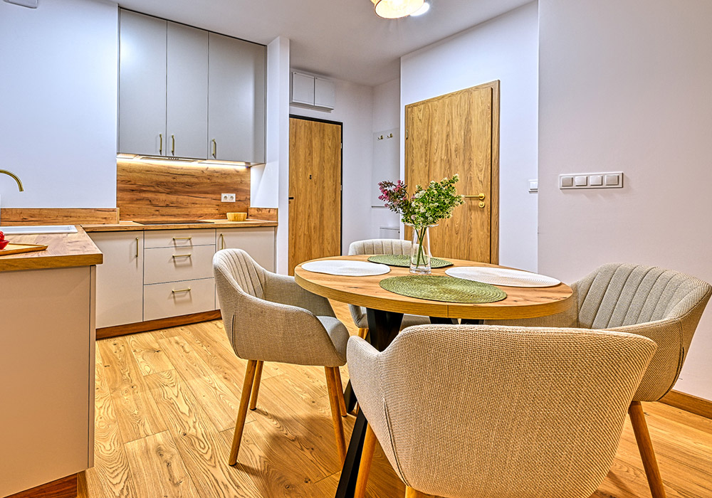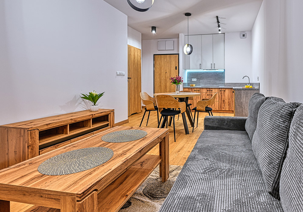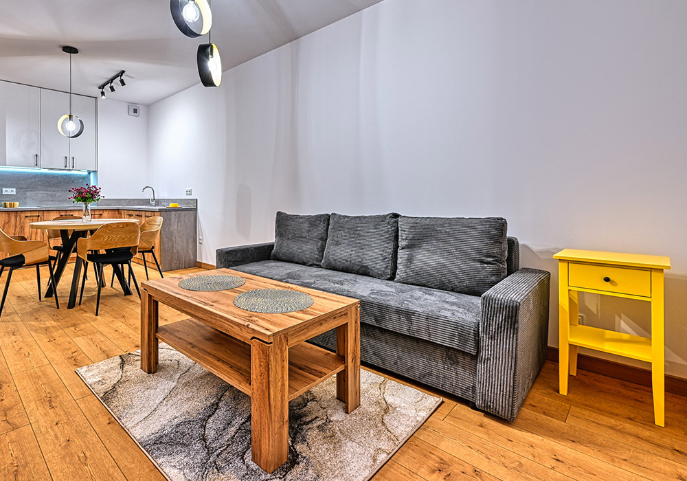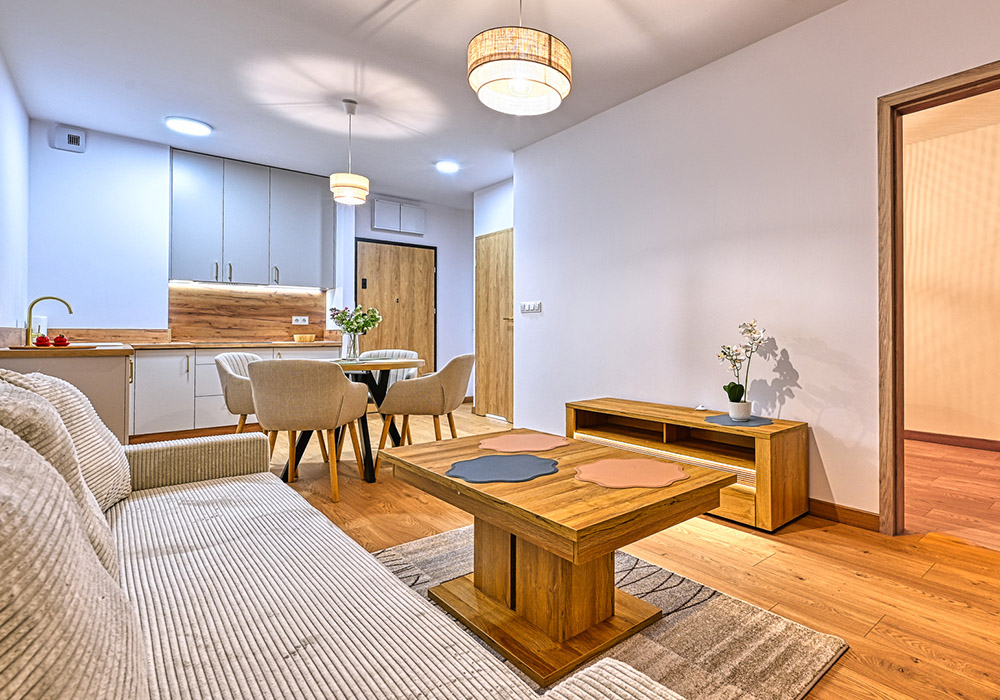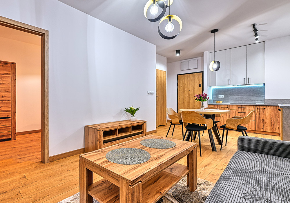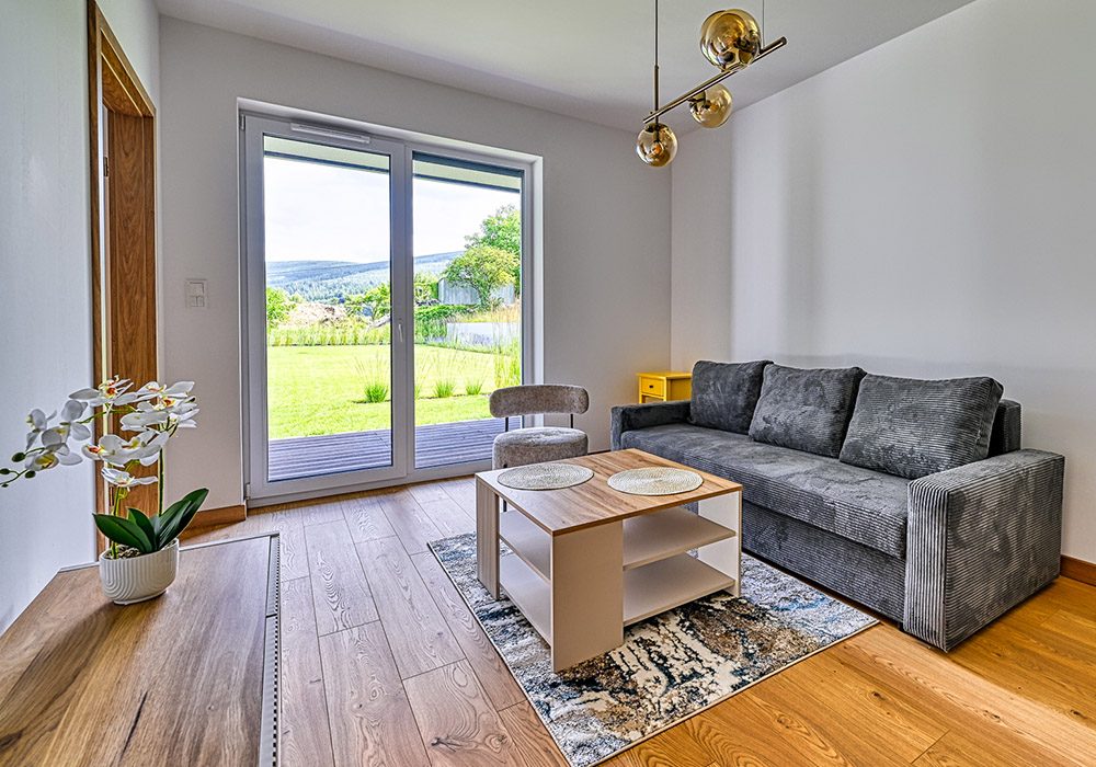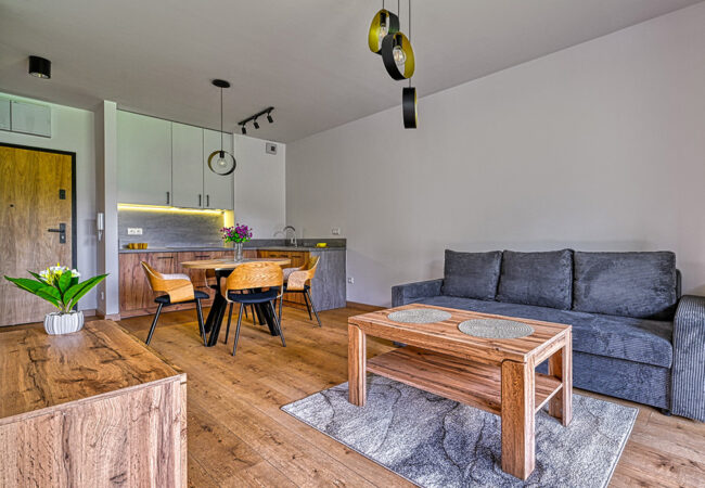 Funkcjonalny apartament z prywatnym tarasem, idealny dla osób, które cenią bliskość natury i spokój. Jasne wnętrza i otwarta przestrzeń sprzyjają relaksowi po dniu spędzonym na górskich szlakach.