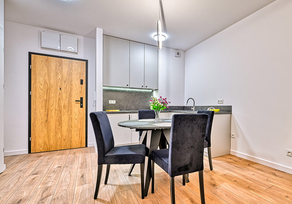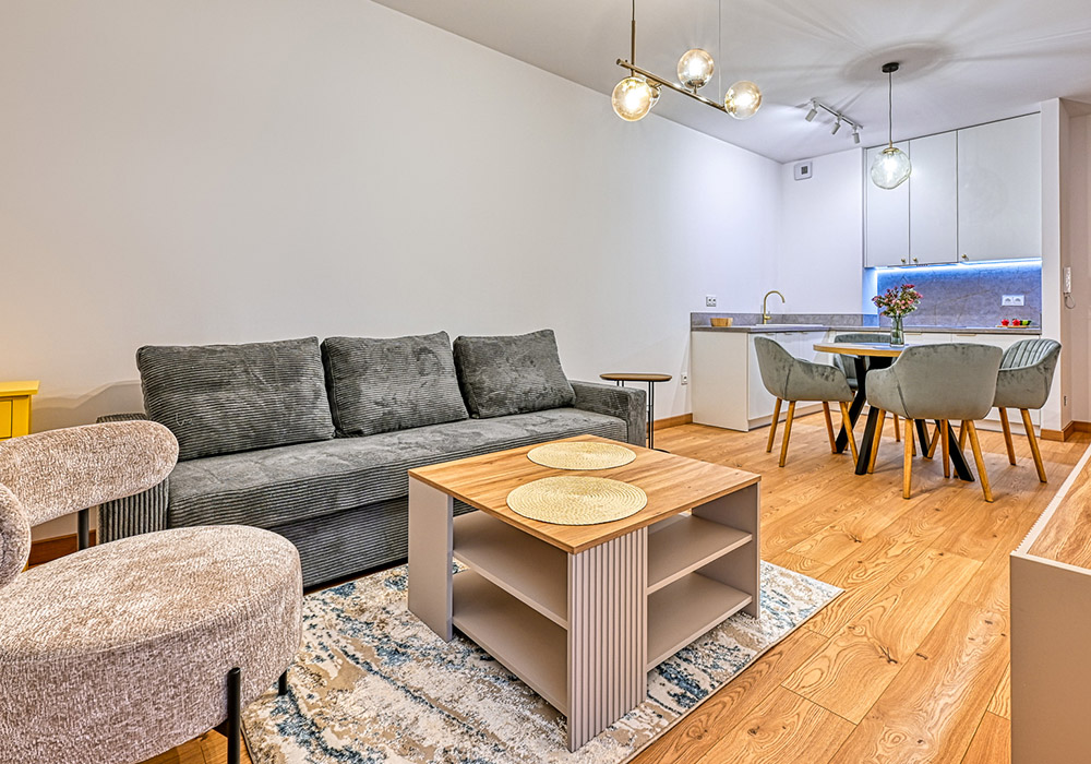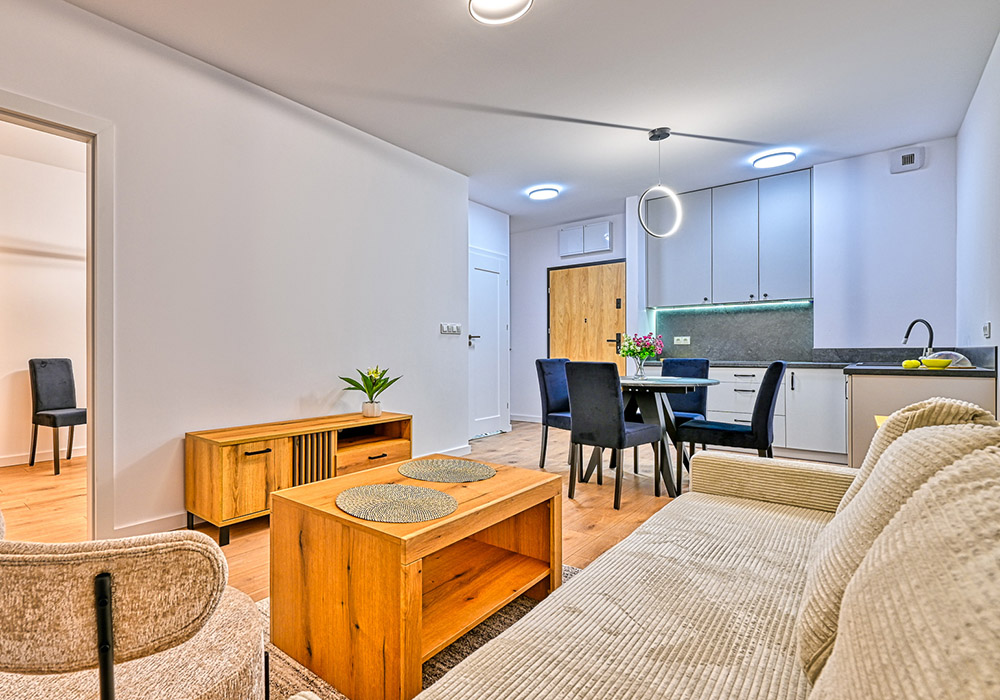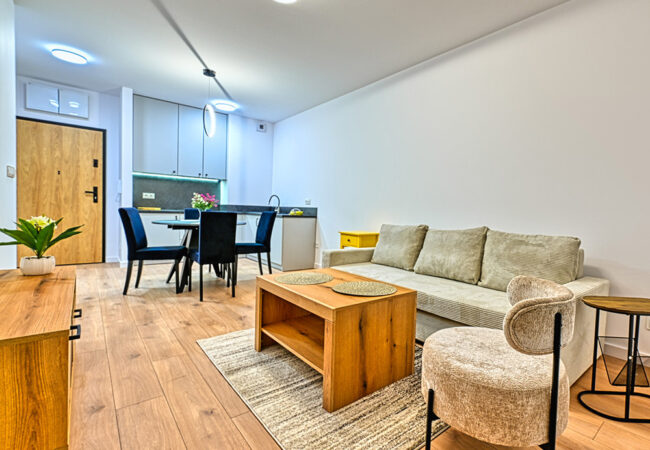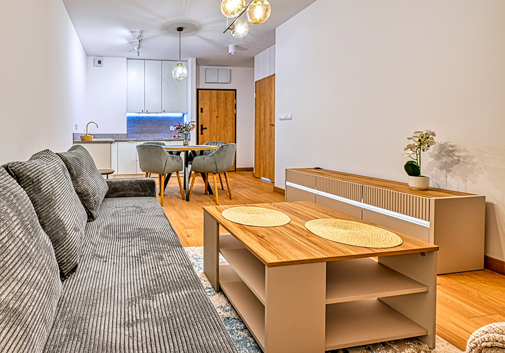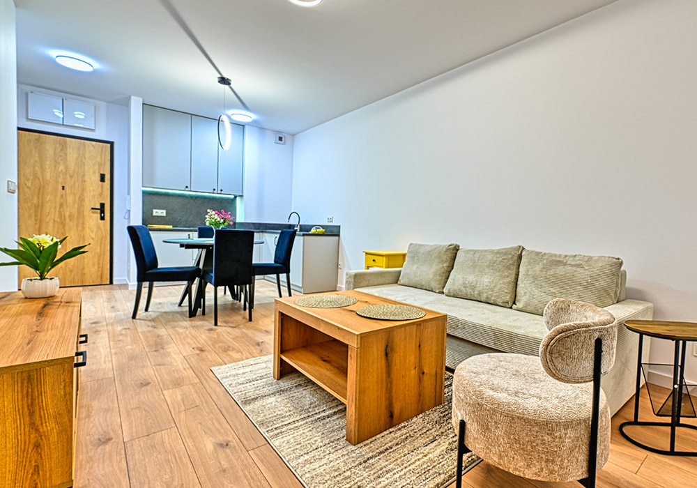 Apartament jest w pełni wykończony, umeblowany i wyposażony – gotowy do najmu lub użytkowania własnego.